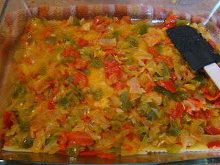 Mientras tanto, cocina las placas de lasaña. Para esta receta no recomiendo usar de las instantaneas, porque al no llevar ni salsa de tomate, ni bechamel, la pasta no tendrá ningún líquido para cocinarse en el horno, y se quedará duras. Una vez hecho el refrito, llega el momento de montar la lasaña. Pon una base de placas de lasaña en una fuente, y encima el refrito de cebolla y pimiento.